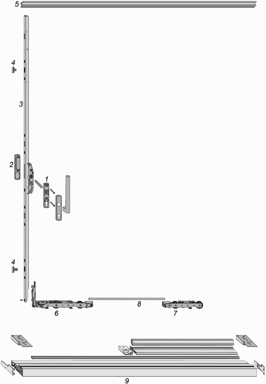 Примечание - В общем случае в состав базового комплекта входят: привод (основной механизм), угловая передача, ножницы, угловой удлинитель (средний запор), петлевая группа (верхние и нижние петли для поворотной или поворотно-откидной створки), ручка, запорные планки, запорно-откидные планки.