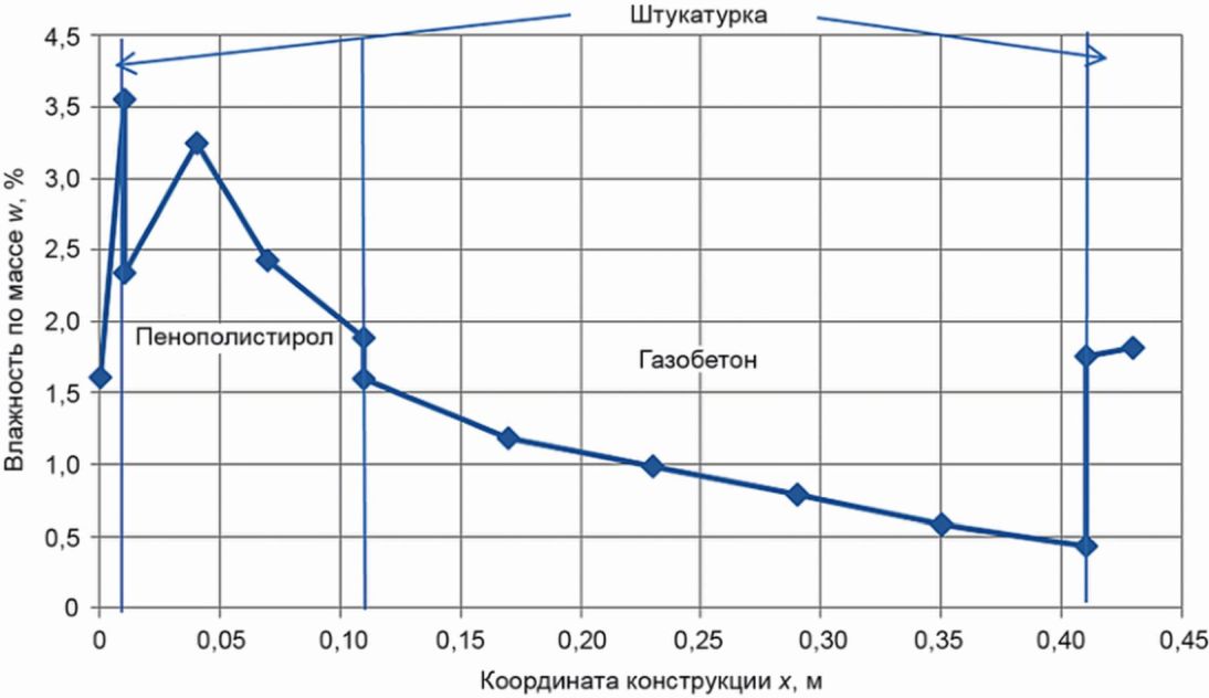 рисунке А.1 в виде распределения влажности внутри конструкции после 3 лет эксплуатации здания, приведенные на начало февраля (месяца наибольшего влагонакопления).