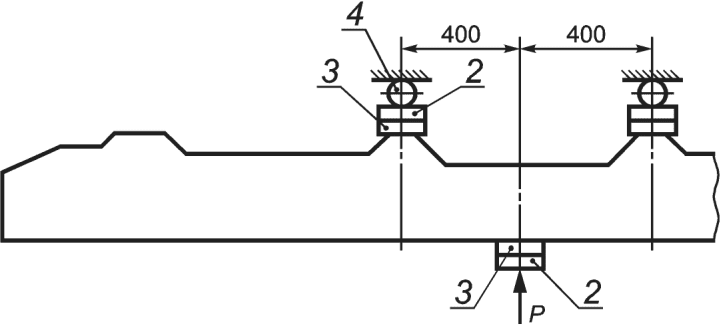 7.13 Определение усилия вырыва закладного элемента проводится на трех брусьях (один элемент на каждом брусе). Испытанию подвергается ближайший к торцу бруса закладной элемент крайней подрельсовой площадки. Схема испытания приведена на