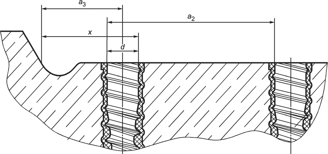 рисунке 12. Нагрузка прикладывается по оси болта или шурупа со скоростью 50 +/- 10 кН/мин, пока не будет достигнуто требуемое значение. Требуемая нагрузка указывается разработчиком в конструкторской документации на брусья и должна быть не менее 90 кН. Прикладываемая нагрузка выдерживается 180 +/- 15 сек и плавно снимается. Глубина заложения закладного элемента после испытаний должна соответствовать