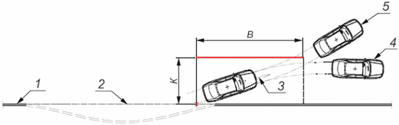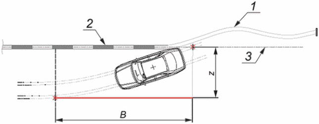 3.3 выбег испытательного автомобиля: Процесс неуправляемого движения испытательного автомобиля после прекращения контакта с ограждением.
