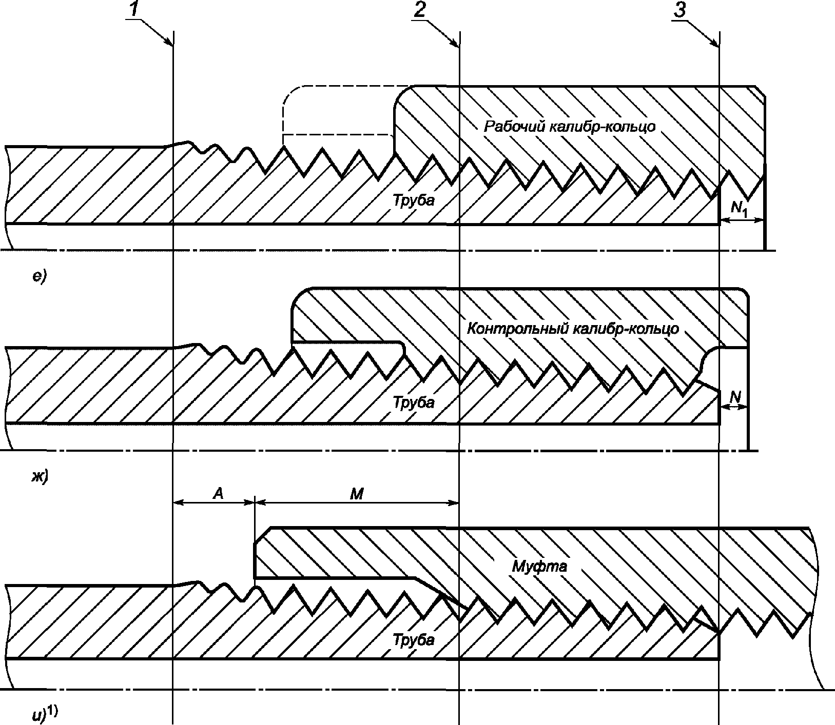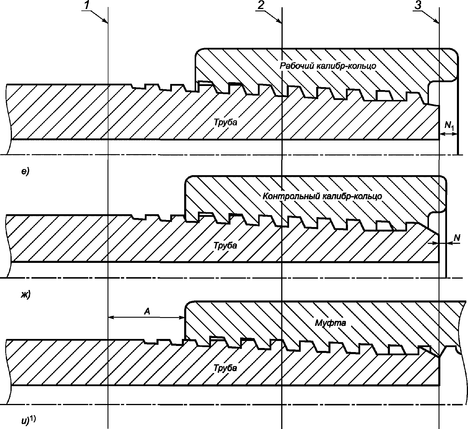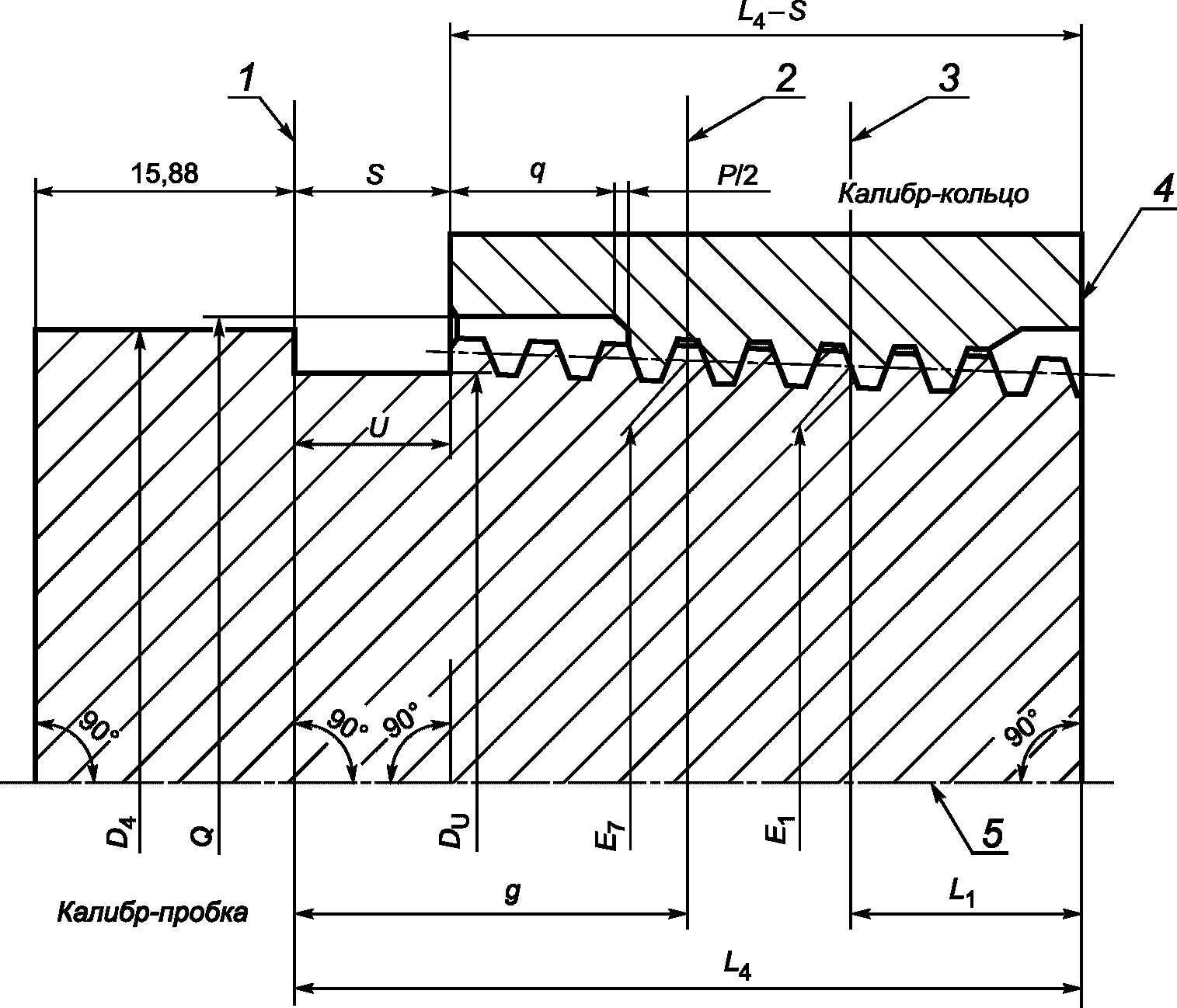 б) внутренняя кромка фланца калибра-пробки является плоскостью конца сбега резьбы на трубе;