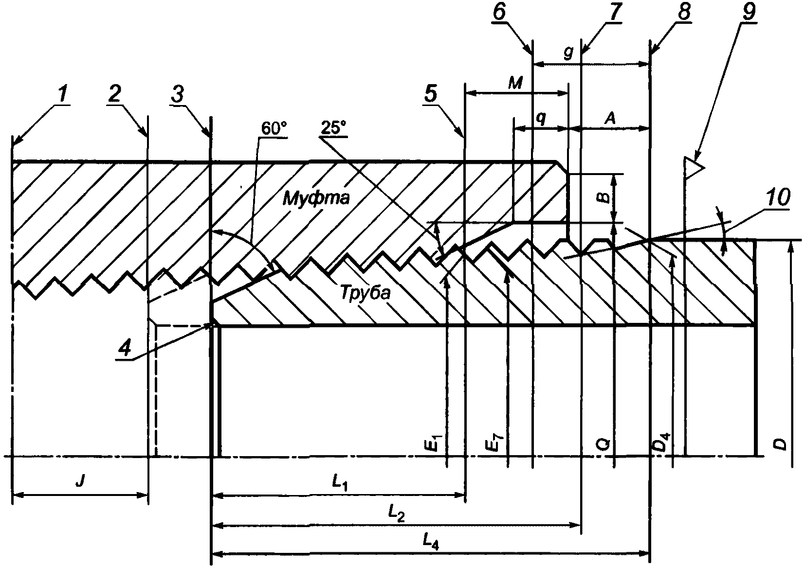 3.1.9 натяг при свинчивании трубы и муфты (make-up standoff of pipe and coupling): Расстояние от торца муфты до плоскости конца сбега резьбы на трубе или до основания треугольного клейма.
