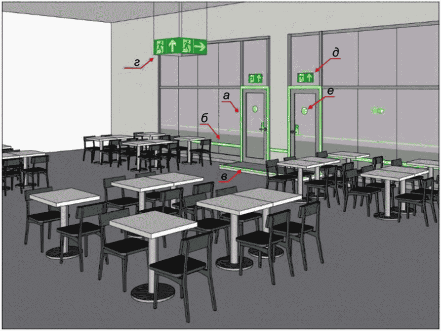 - электротехнические (с элементами, потребляющими электрическую энергию) системы освещения и обозначения путей эвакуации;