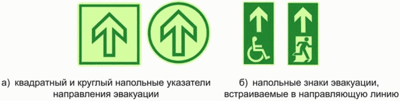 Примечание - В больших помещениях, где требуется указать направление выхода с длинных дистанций или нескольких сторон, рекомендуется применять подвесные объемные указатели направления эвакуации, а также указатели направления эвакуации, размещенные над дверями выходов.