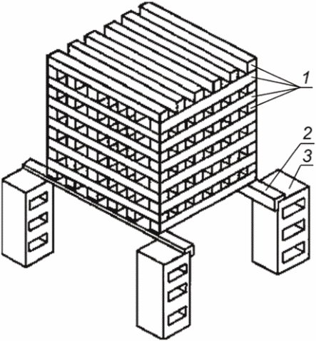 Бруски, образующие наружные грани штабеля, допускается скреплять для прочности скобами или гвоздями. Штабель выкладывается таким образом, чтобы бруски каждого последующего слоя были перпендикулярны брускам нижележащего слоя. При этом по всему объему должны образовываться каналы прямоугольного сечения.