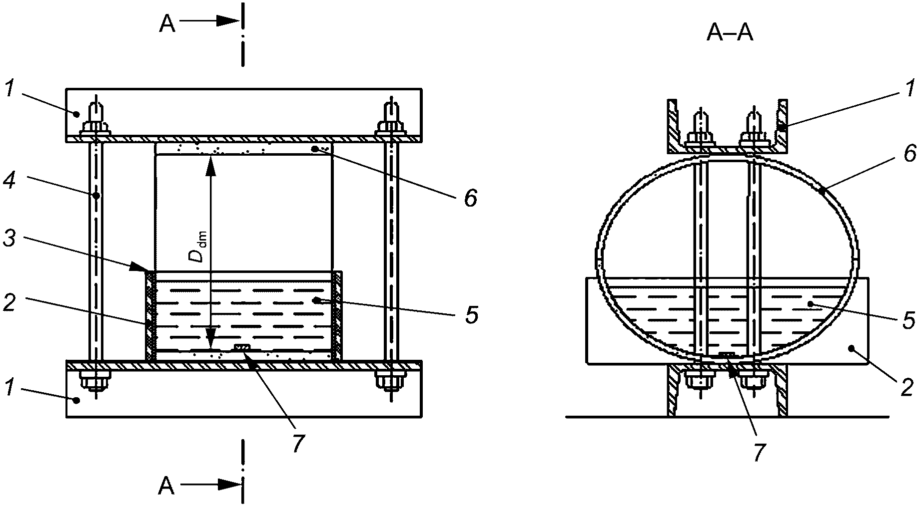 5.1 Средства измерения линейных размеров образца (длина, диаметр, толщина стенки), обеспечивающие погрешность измерения не более +/- 0,5%. 5.2 Средство измерения кольцевой деформации, обеспечивающее погрешность измерения +/- 1% от максимального значения измеряемой величины. 5.3 При использовании фольговых тензорезисторов рекомендуется применять тензорезисторы с длиной чувствительного элемента от 6 до 12 мм при испытании образцов номинальным диаметром 300 <= DN < 600. При испытании образцов с другим номинальным диаметром длину чувствительного элемента выбирают в соответствии с рекомендациями производителя тензорезисторов. Тензорезисторы должны быть стойкими к воздействию испытательной среды. 5.4 Испытательная установка, в состав которой входят следующие основные элементы: - нагрузочная рама, состоящая из двух параллельных металлических пластин с ребрами жесткости; - стержни с резьбой и гайками, при помощи которых устанавливают и поддерживают постоянное значение кольцевой деформации образца. Схема испытательной установки, а также перечень дополнительного оборудования приведены на рисунке 1. |