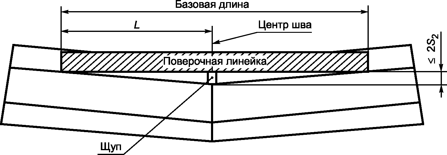 3.1.1 базовая длина: Длина поверочной линейки, регламентированная для каждого метода измерения выпуклости или вогнутости стыка сваренного контактной сваркой рельса, стыков узла сварного комбинированного, метода измерения местных неровностей стыка рельса, сваренного контактной сваркой, стыков вставки/прослойки узла сварного комбинированного.