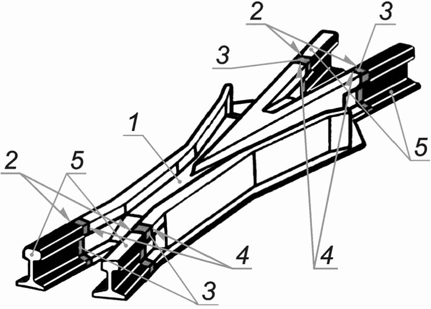 моноблочная крестовина: Крестовина с цельнолитым блоком сердечника с усовиками и приварными рельсовыми окончаниями. |