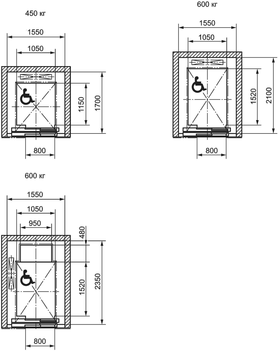 1 На настоящем рисунке представлены размеры лифтов со скоростью до 2,5 м/с включительно.