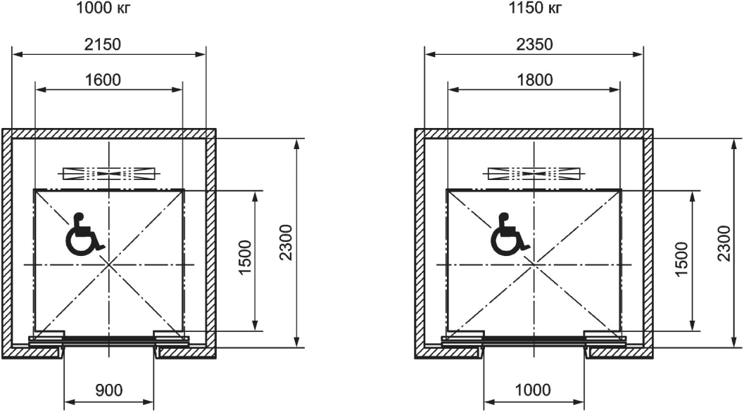 1 На настоящем рисунке представлены размеры для лифтов со скоростью до 2,5 м/с включительно.