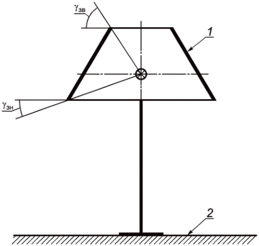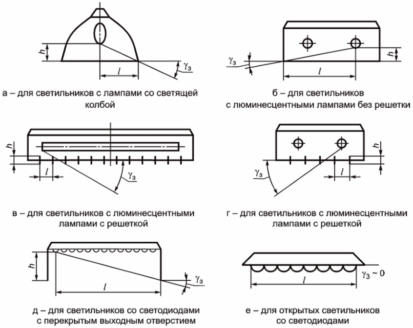 3.10 защитный угол: Угол в характерной плоскости, в пределах которого глаз наблюдателя защищен от прямого излучения источников света в светильниках, имеющих открытое выходное отверстие или перекрытое прозрачным защитным стеклом или светоотражающей решеткой как для нижней, так и для верхней полусферы.