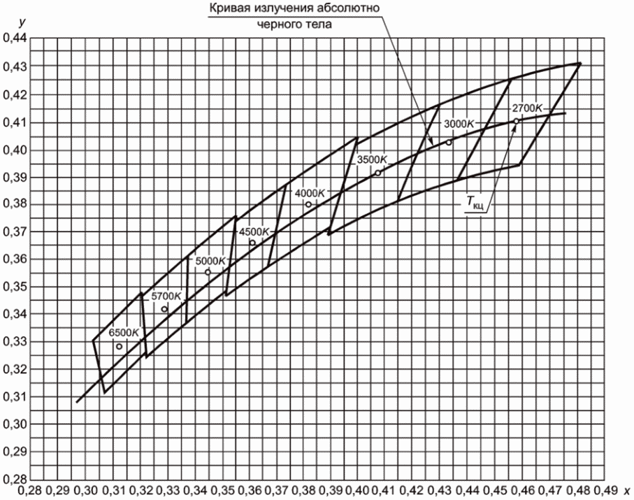 Координаты цветности четырехугольников допустимых отклонений коррелированной цветовой температуры приведены в таблице К.1.