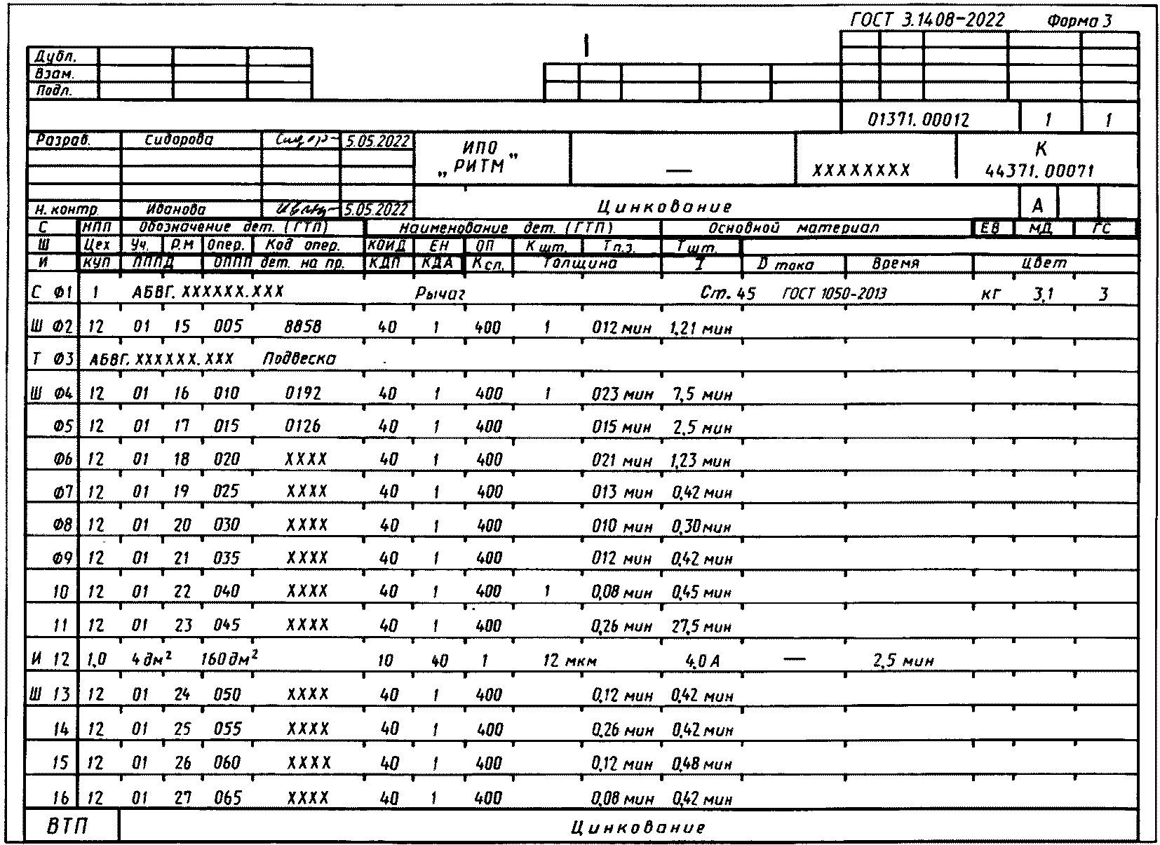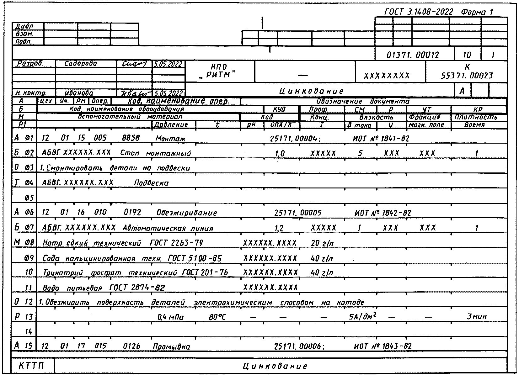 ГОСТ 3.1118. Допускается вводить в формы МК дополнительные графы для указания обозначений данных, используемых при выполнении операций получения покрытий, по технологическим режимам с привязкой к служебному символу "Р", по характеристикам покрытий и по обрабатываемым деталям с привязкой к служебному символу "И" в соответствии с формами КТТП, ВТП, например "