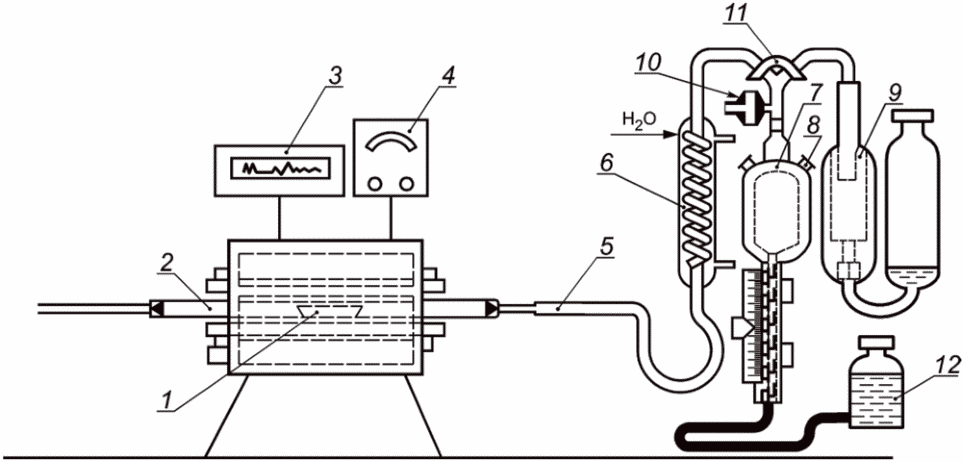 Установку (см. рисунок 2) приводят в рабочее состояние. Нагревают печь до рабочей температуры и прокаливают фарфоровую трубку по всей длине.