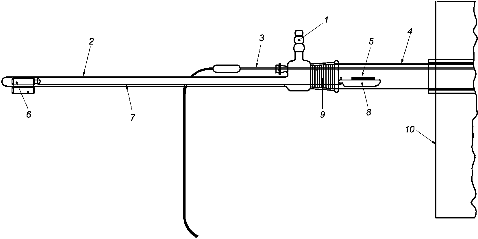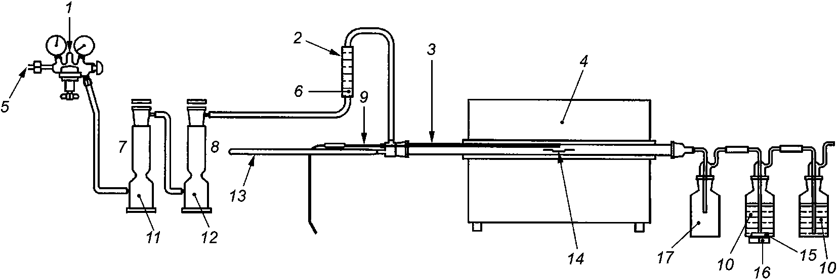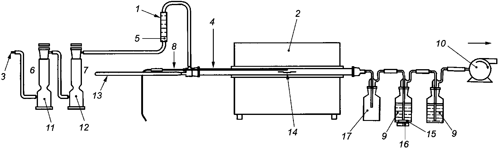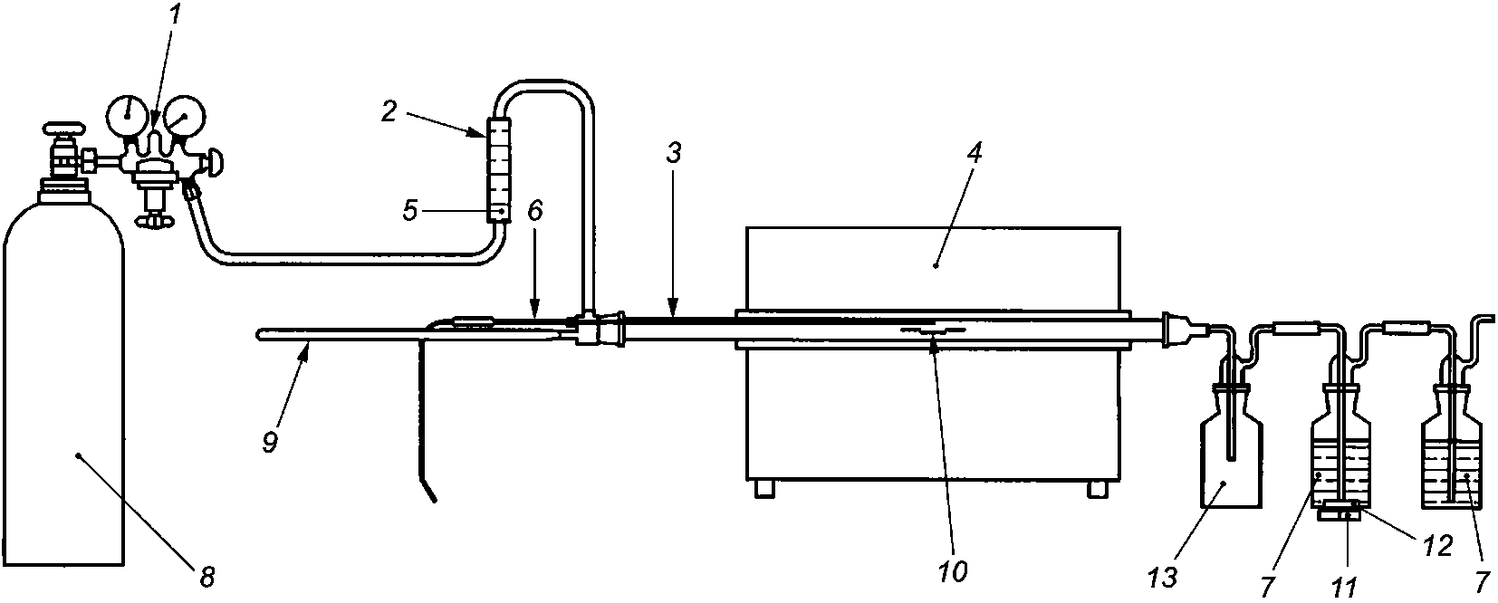 Лодочку с испытуемым образцом быстро вводят в зону нагрева трубки и располагают в указанном положении, определяемом с использованием термопары, и включают секундомер. Лодочку для сжигания устанавливают таким образом, чтобы расстояние между лодочкой и входным концом рабочей зоны нагрева было не менее 300 мм. Рабочая зона нагрева - это зона, в которой температура, определяемая с помощью термопары, составляет не менее 900 °C.