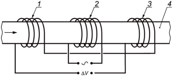 Минимальная длина обнаруживаемого продольного дефекта определяется схемой расположения катушек и скоростью смены секций вдоль длины дефекта.