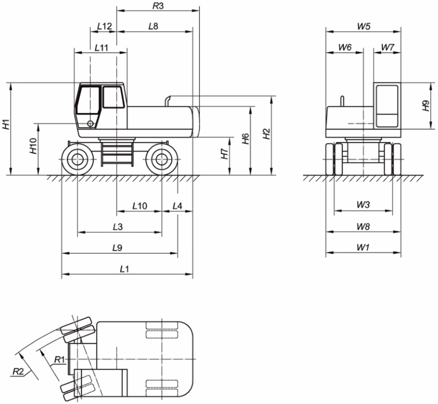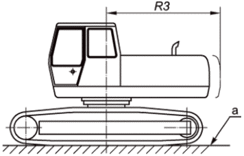 R3 | радиус поворота (задней части) (swing (rear-end) radius): Расстояние по координатной оси Y (плоскость Z) между осью вращения и крайней задней точкой поворотной платформы | |