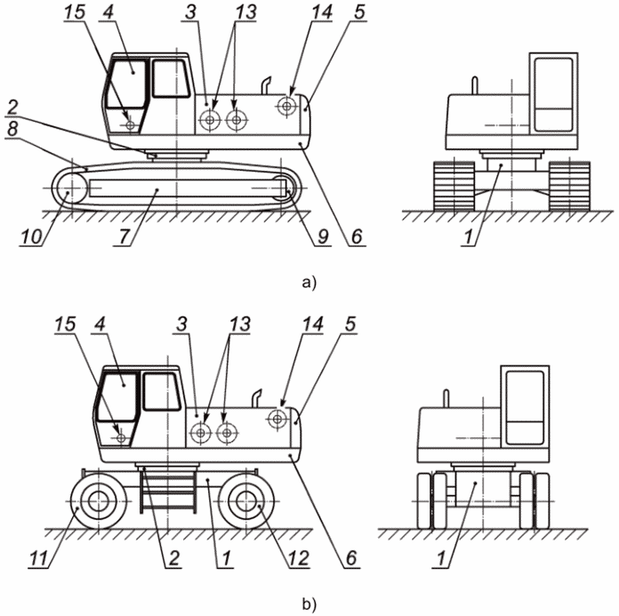3.1 экскаватор (excavator): Самоходная машина на колесном, гусеничном или шагающем ходу, имеющая верхнюю часть, способную поворачиваться на 360°, со смонтированным рабочим оборудованием, предназначенная главным образом для копания с помощью ковша без перемещения ходовой части в течение всего рабочего цикла машины.
