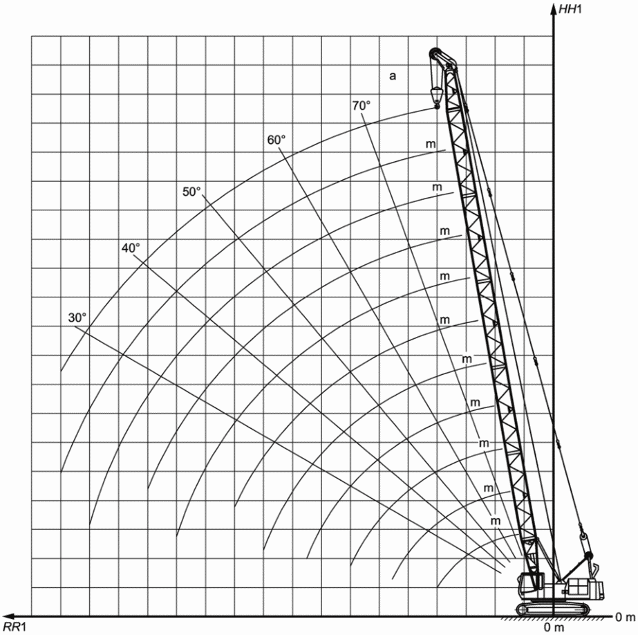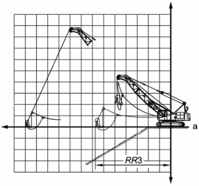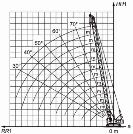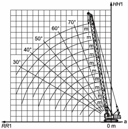 RR1 | досягаемость при применении подъемного оборудования (reach of lifting equipment application): Расстояние по координатной оси X (плоскость Z) между осью вращения и осью блока крюка в зависимости от высоты подъема HH1 и конфигурации стрелы | |