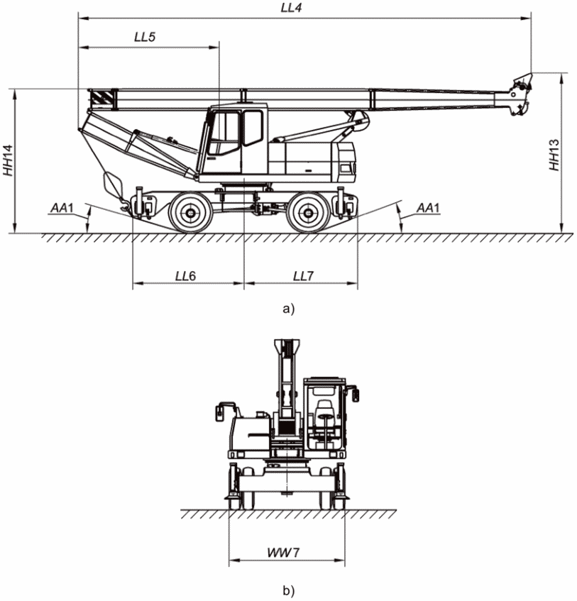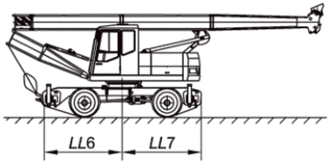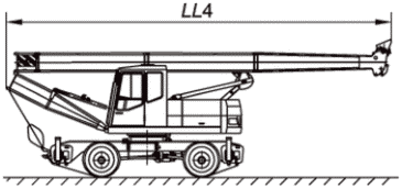 LL4 | габаритная длина в положении перемещения (overall length in travelling condition): Расстояние по координатной оси X между двумя плоскостями X, проходящими через самые крайние точки спереди и сзади машины в положении перемещения | |