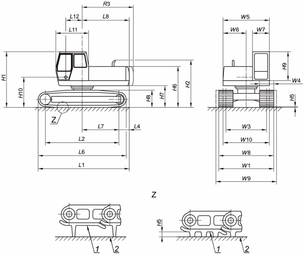 W9 | максимальная ширина с узкими или широкими гусеницами (maximum width with track extended or retracted): Расстояние по координатной оси Y между двумя плоскостями Y, проходящими через самые удаленные точки гусеничного движителя, для широких гусениц, или расстояние по координатной оси Y между двумя плоскостями Y, проходящими через наружные поверхности гусеничного движителя, для узких гусениц | |