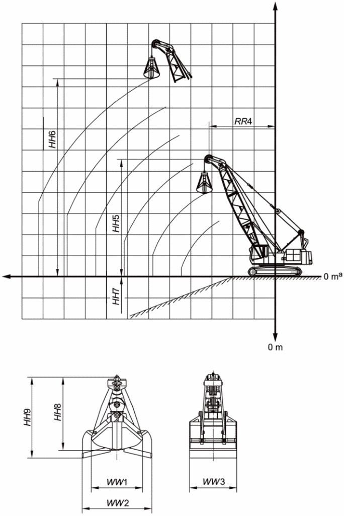 HH6 | максимальная высота выгрузки грейфера при применении захвата (maximum dumping height of clamshell in drab application): Расстояние по координатной оси Z между GRP и самой нижней точкой грейфера в закрытом положении, когда грейфер находится в самом высоком положении выгрузки относительно конфигурации стрелы | |