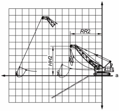 RR2 | досягаемость при применении драглайна (reach of dragline equipment application): Расстояние по координатной оси X (плоскость Z) между осью вращения и канатом драглайна в зависимости от высоты стрелы HH2 и конфигурации стрелы | |