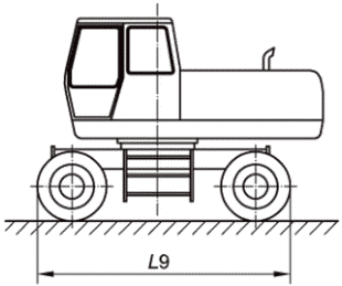 L9 | габаритная длина шасси (undercarriage overall length): Расстояние по координатной оси X между двумя плоскостями X, проходящими соответственно через крайние точки на передней и задней частях шасси | |