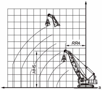 HH5 | высота стрелы при применении захвата (boom height of grab application): Расстояние по координатной оси Z между GRP и шарниром головки стрелы относительно достижения RR4 и конфигурации стрелы. Примечание - Кривые подъема захвата в закрытом положении добавлены относительно конфигурации стрелы | |