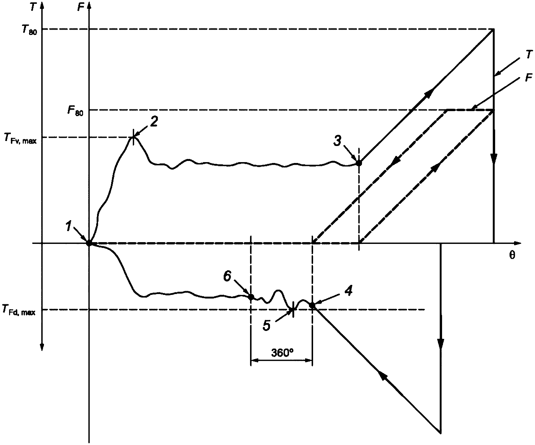 Во время откручивания гайки вращение должно быть непрерывным и равномерным от усилия предварительной затяжки при испытании F80 до точки 1.