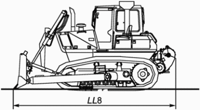 LL8 | Максимальная длина Расстояние по координате X между двумя плоскостями X, проходящими через наиболее удаленные точки передней и задней части машины с бульдозерным отвалом и лебедкой | |