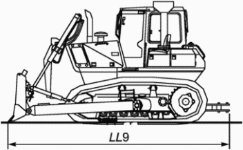 LL9 | Максимальная длина Расстояние по координате X между двумя плоскостями X, проходящими через наиболее удаленные точки передней и задней части машины с бульдозерным отвалом и поворотным сцепным устройством | |