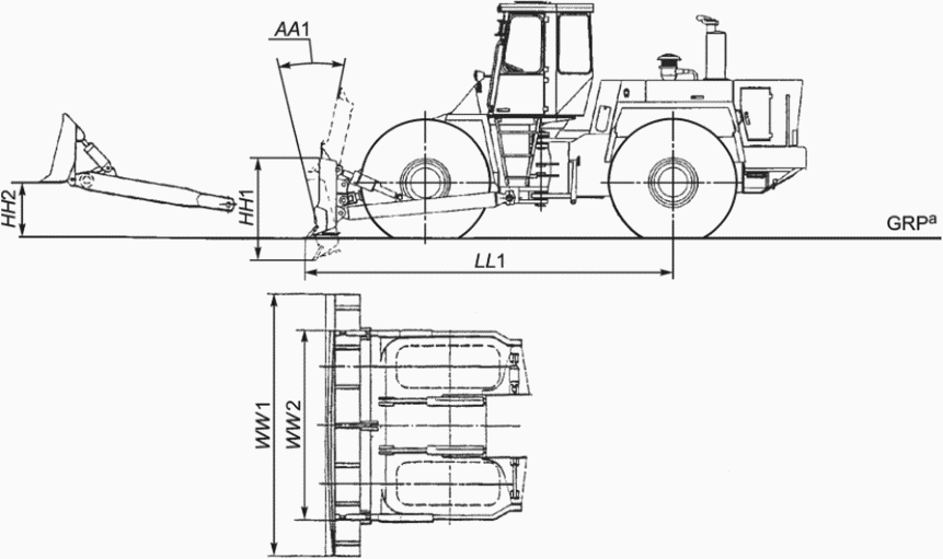 LL1 | Передняя проекция Расстояние по координате X между двумя плоскостями X, проходящими через ось ведущей или натяжной задней звездочки гусеничной машины или ось заднего колеса колесной машины и крайней точкой рабочего оборудования. Измерения проводят в положении отвала на опорной поверхности в средней его точке, без наклона и перекоса, рабочее оборудование на GRP, крайняя точка определяется по концу крайней секции ножа | |