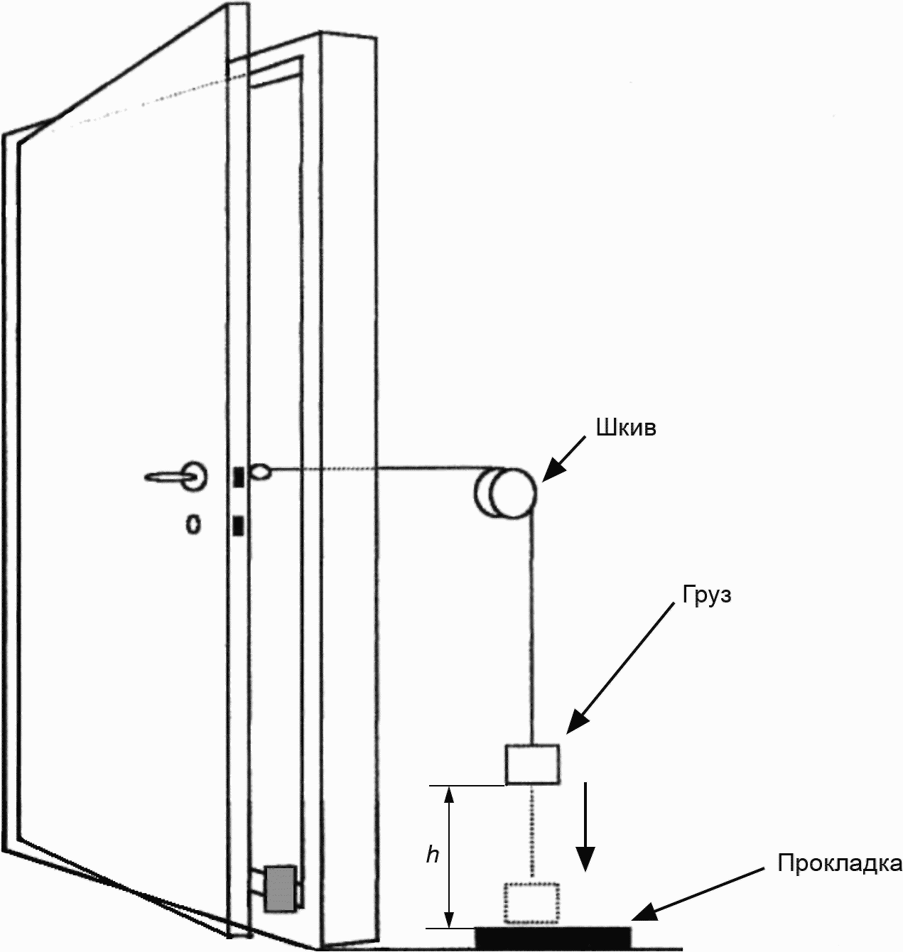 7.2.6), дверь испытания выдержала. В противном случае откроется зазор для прохода воздуха и снизятся показатели звукоизоляции, устойчивости к взлому. Схемы приложения динамических нагрузок приведены на рисунках В.1 -