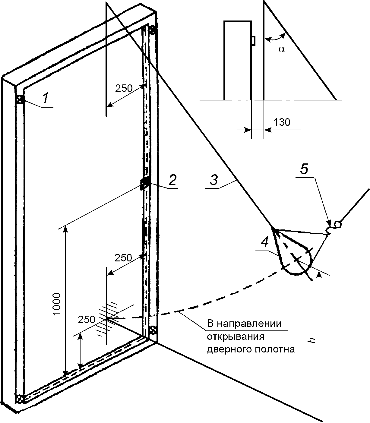 В.2.1 При определении сопротивления статической нагрузке, прикладываемой в плоскости дверного полотна, нагрузку (последовательно от меньшей к большей) прикладывают в направлении открывания дверного полотна (при этом дверь должна быть закрыта на все запоры) в зоне свободного угла (точка приложения задана) в течение 5 мин.