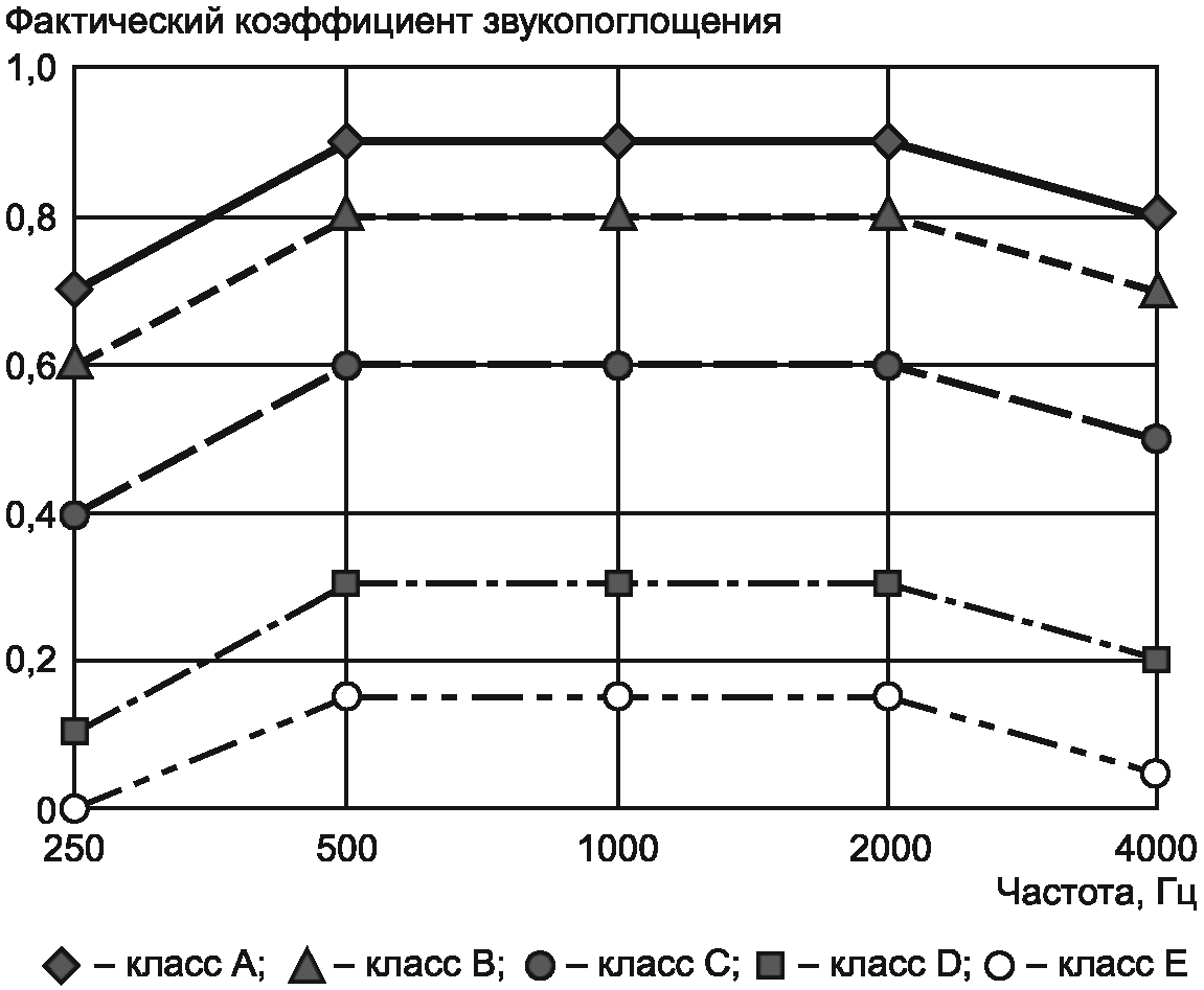 ГОСТ 23499 и в соответствии с таблицей Б.5, индекс звукопоглощения ограничивает снизу коэффициент звукопоглощения на частоте 500 Гц, в то время как информация о классе звукопоглощения подразумевает ограничения по частотному спектру в соответствии с нормативными кривыми