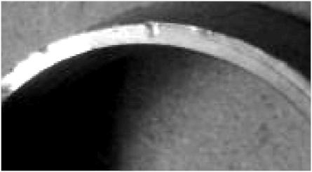 Примечания 1 Является дефектом в следующих случаях: - расположена на резьбе с полным профилем, упорных или уплотнительных элементах резьбового соединения; - приводит к несоответствию геометрических параметров других элементов резьбового соединения; - приводит к отслоению антизадирного покрытия. 2 Может быть расположена на любом элементе резьбового соединения. 3 Образуется в результате ударного воздействия на резьбовое соединение: - в процессе производства - при перемещении, контроле, испытаниях и упаковке; - в процессе транспортирования и при погрузочно-разгрузочных операциях; - в процессе эксплуатации - при спуско-подъемных операциях (посадке верхней трубы в муфту или раструбный конец нижней трубы). 4 Рекомендуется удаление с помощью тонкого шлифовального инструмента. | | |