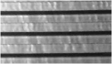 3.17 следы вибрации (Нрк. волнистость, дробление, дрожь, огранка, пьяная резьба, рябь): Множественные периодически повторяющиеся неровности профиля (см. рисунок 14). а) Следы вибрации, приводящие к несоответствию геометрических параметров наружной резьбы и заходной фаски б) Следы вибрации, приводящие к несоответствию геометрических параметров расточки и заходной фаски в) Следы вибрации в виде изменений отсвета поверхности (световых бликов), не приводящие к несоответствию геометрических параметров резьбы Рисунок 14 - Следы вибрации | en | chattered threads, drunken threads, wavy threads |