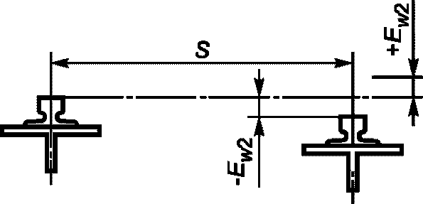 Ew2 | Допуск на превышение одного рельса над другим, измеренное в любой плоскости, перпендикулярной к направлению рельсового пути грузовой тележки в любой его точке | ![]() | +/- 12,5 | +/- 16 | +/- 20 | +/- 25 | 0/00 |