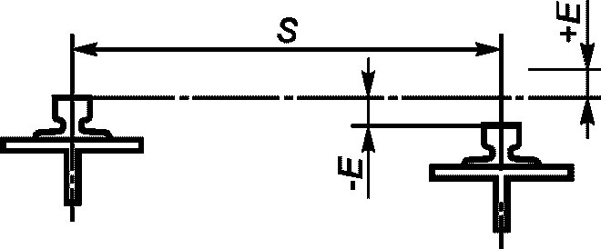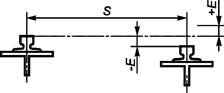 E | Допуск на превышение одного рельса над другим, измеренное в любой плоскости, перпендикулярной к направлению рельсового пути | ![]() | +/- 0,5S, но не более +/- 5 | +/- S, но не более +/- 10 | +/- 2S, но не более +/- 20 | +/- 4S, но не более +/- 40 | мм |