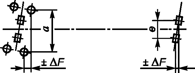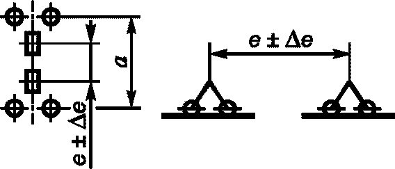 Допуск на отклонение продольной оси ходовых колес тележки от продольной оси рельса | ![]() | +/- 0,32a; +/- 0,4e | +/- 0,4a; +/- 0,5e | +/- 0,5a; +/- 0,63e | +/- 0,63a; +/- 0,8e | мм | |