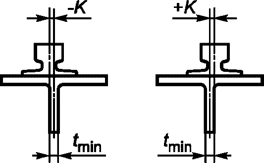 K | Допуск на смещение вертикальной оси рельса относительно вертикальной оси стенки подрельсовой металлоконструкции | tmin - минимальная толщина стенки подрельсовой металлоконструкции ![]() | +/- 0,5tmin | - | мм | ||