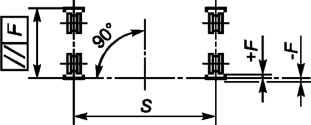 F | Допуск на отклонение от общей вертикальной плоскости упоров или буферов тележки | ![]() | +/- 0,8S, но не более +/- 8 | +/- S но не более +/- 10 | +/- 1,25S, но не более +/- 12,5 | +/- 1,6S, но не более +/- 16 | мм |
