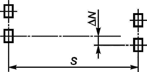 P3 | Отклонение расстояния между осями симметрии рельсов (двутавров) одно- и двухпролетных крановых путей. Примечание - При двух и более пролетах два одинаковых знака в одном поперечном сечении не допускается | ![]() | 0,002S | мм |