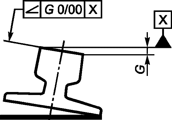 G | Допуск на отклонение вертикальной оси поперечного сечения рельса от вертикали на всей длине рельсового пути | ![]() | 4 | 6 | 9 | 12 | 0/00 |