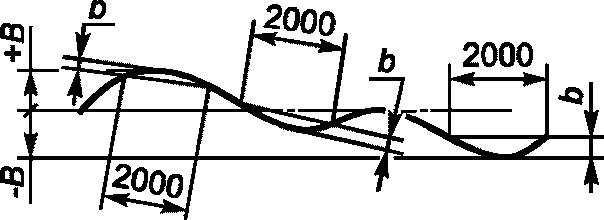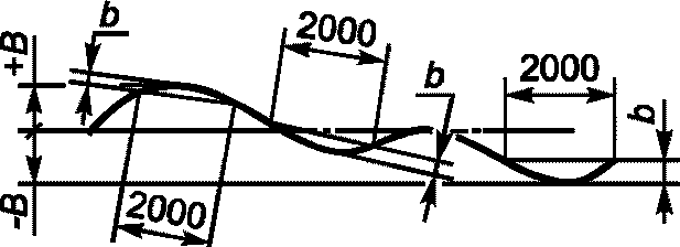 b | Допуск на прямолинейность рельса в горизонтальной плоскости на определенном участке (например, длиной 2 м) | Расположение рельса в плане ![]() | 1 | 1 | 2 | 4 | мм |
