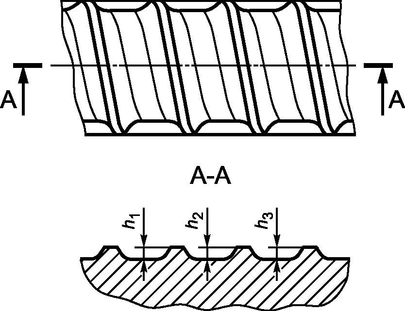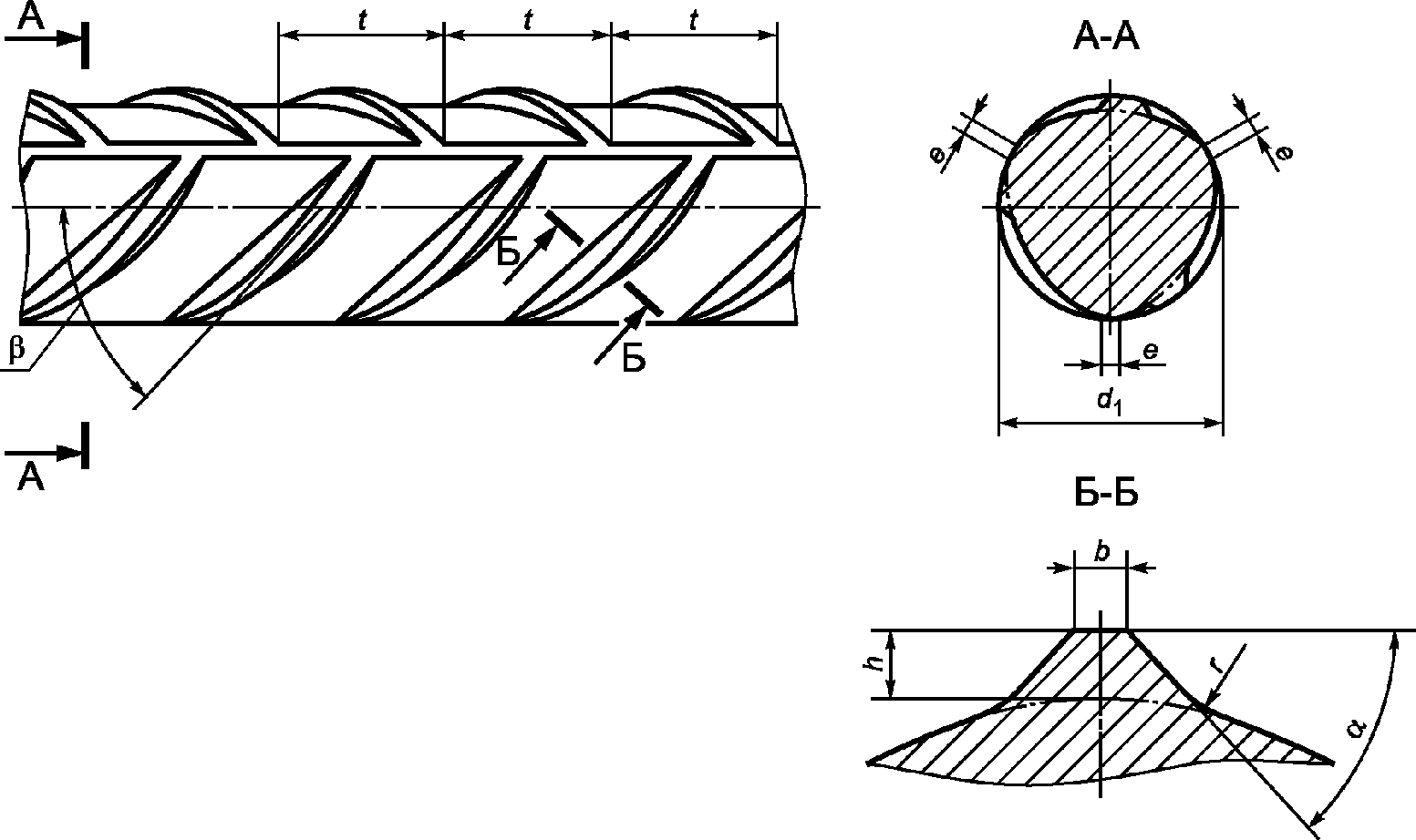 3.1 арматурный прокат периодического профиля: Прокат в прутках или мотках с равномерно расположенными на его поверхности под углом к его продольной оси поперечными ребрами для улучшения сцепления с бетоном.