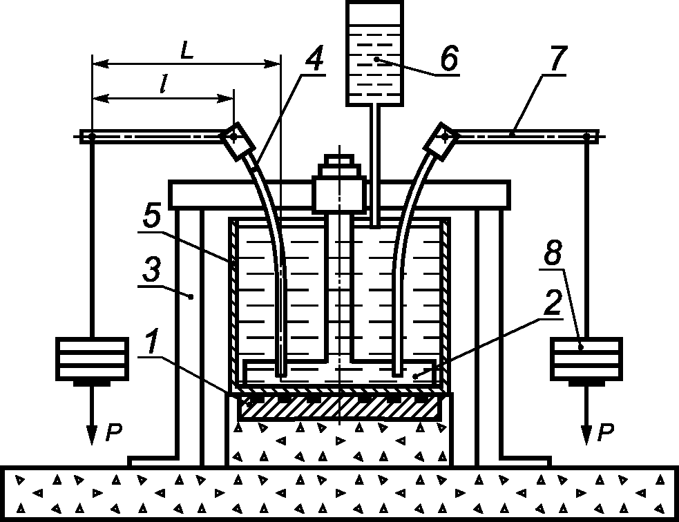 Применяют рычажную установку консольного типа, обеспечивающую постоянно приложенную изгибающую нагрузку в течение всего периода испытаний с погрешностью не более 2%. Схема установки приведена на рисунке Ж.1.