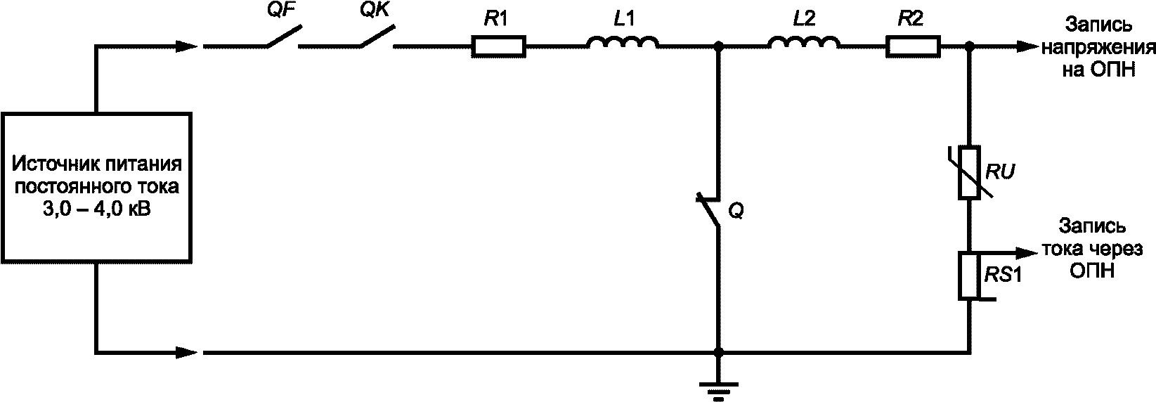 Б.1 Схема испытательной установки для проверки ОПН постоянного тока на взрывобезопасность приведена на рисунке Б.1.